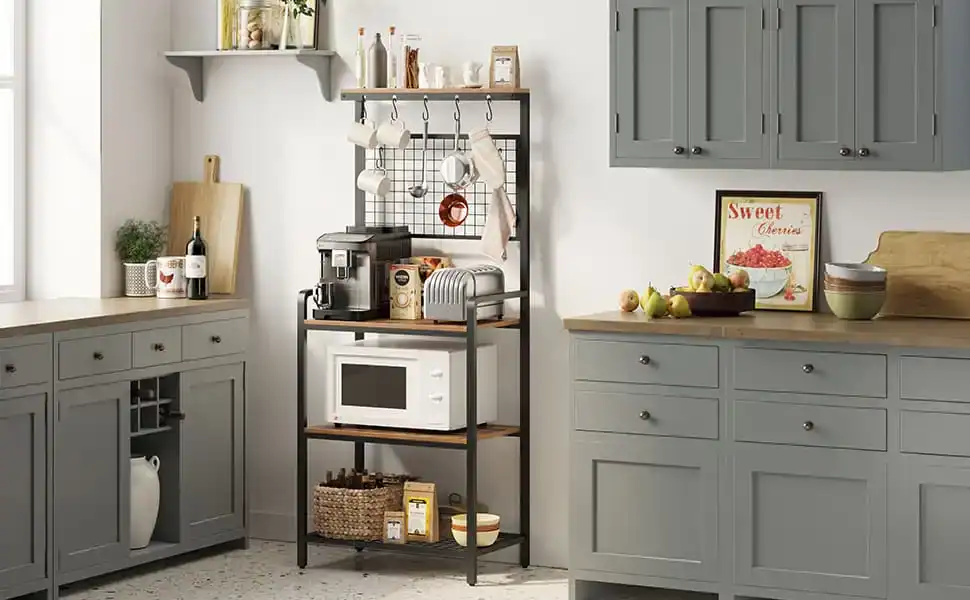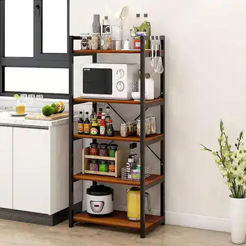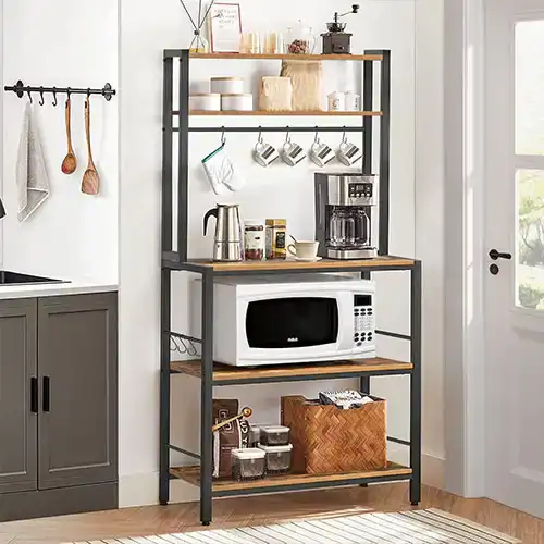 The Baker’s Rack is made from durable iron, guaranteed to hold up under daily use. It has 4 tiers with ample storage space for kitchen appliances and dishes. The rack is also easy to clean with cloth and water, making it ideal for any home setting that needs extra storage space for kitchen items.